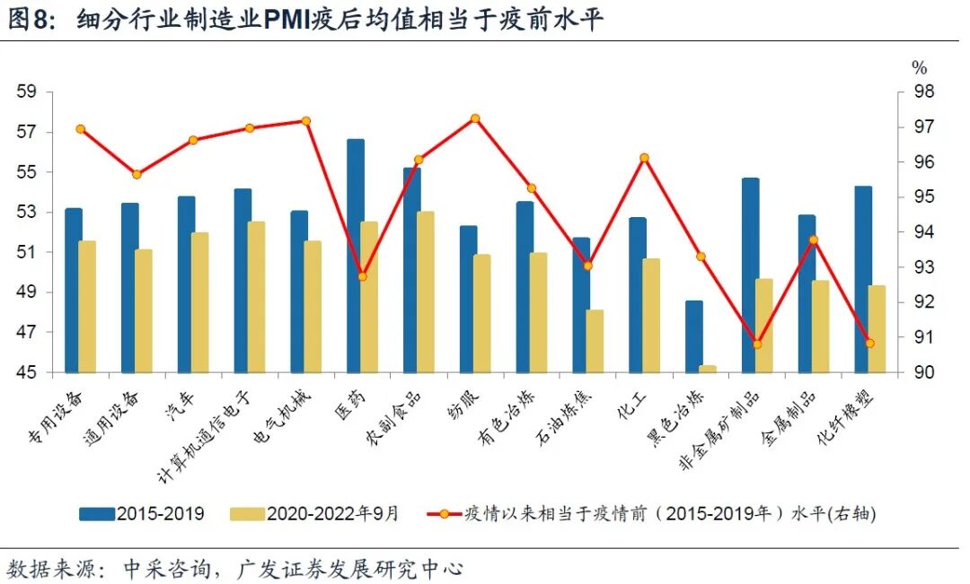 分别计算2020年至2022年9月、2015-2019年两大区间内的制造业各细分行业PMI平均水平,按照疫后PMI均值相当于2015-2019年均值水平来看: