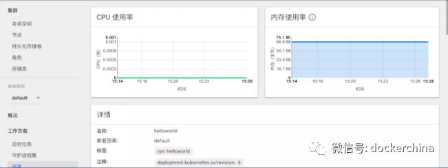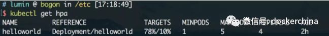 kubectl autoscale deployment helloworld --cpu-percent=10 --min=1 --max=5 运行上面的命令后,可以在dashboard看到HPA已经被创建,策略是以CPU使用率10%为临界值,最少副本集数量为1,最大为5: