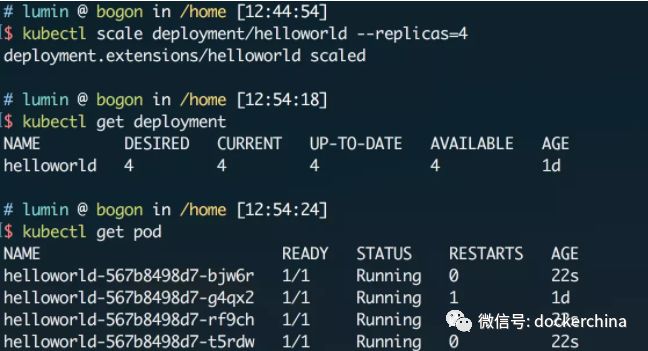 我们可以使用kubectl scale命令来手动调整deployment的规模,现在尝试把helloworld服务的副本数量扩充到4个: