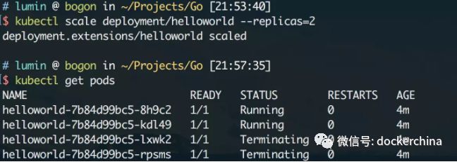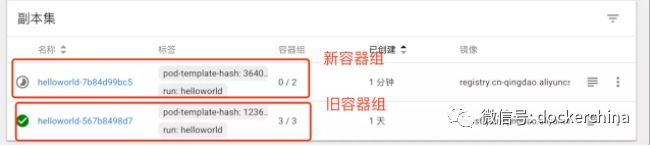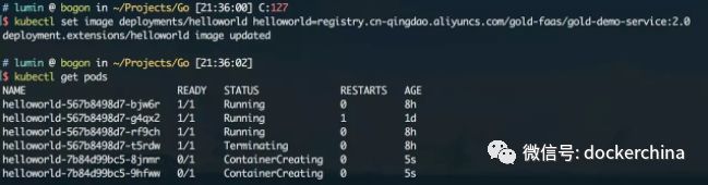 kubectl set image deployments/helloworld helloworld=registry.cn-qingdao.aliyuncs.com/gold-faas/gold-demo-service:2.0 执行该命令后,可以从kubectl和dashboard中看到,新的容器组正在被创建,同时旧的容器组也在被回收: