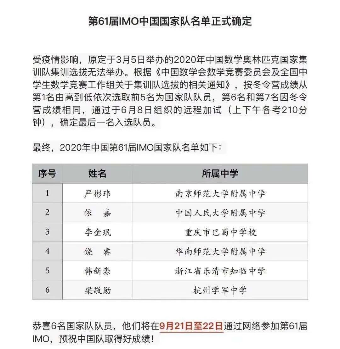 今天刚得到消息说2020年的数学国家队6人名单正式确定了。