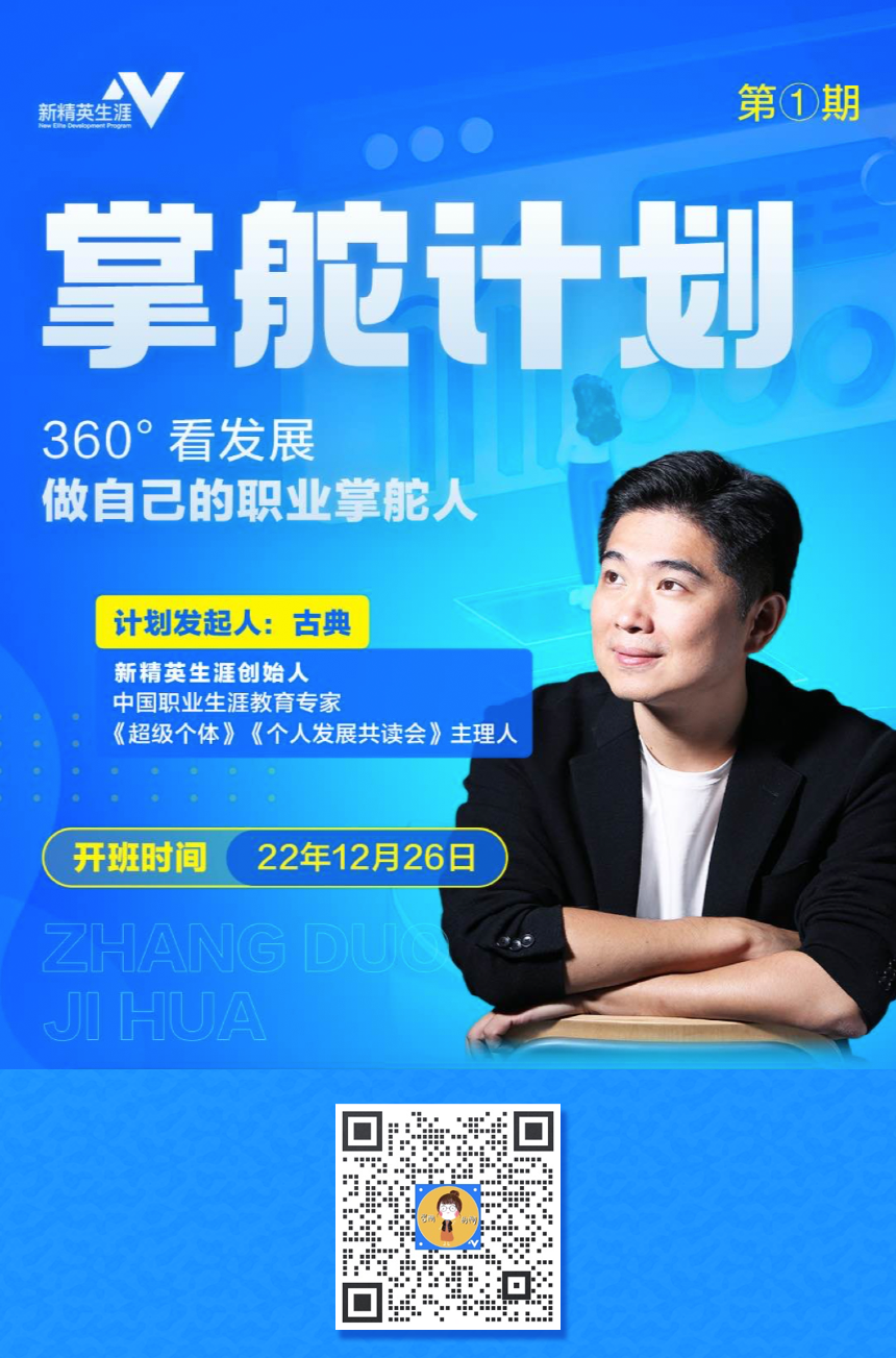如果你有类似困惑,推荐你参加古典老师发起的第1期【掌舵计划】。6周时间,带你看懂职业现状, 认清个人兴趣和优势,并制定出未来3年的职业发展计划。12月26日开班,名额只有200个。本期优惠价1080元,下期将恢复原价1280元。 深度原创: