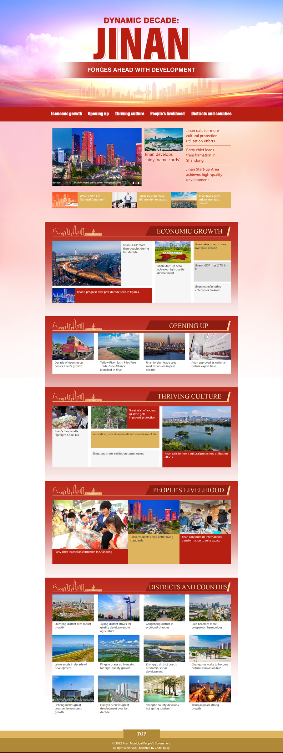 专题共设置“经济增长”“改革开放”“文化建设”“民生福祉”“区县发展”等五大板块,通过文字、图片、视频等多样化形式展示济南十年发展成就。