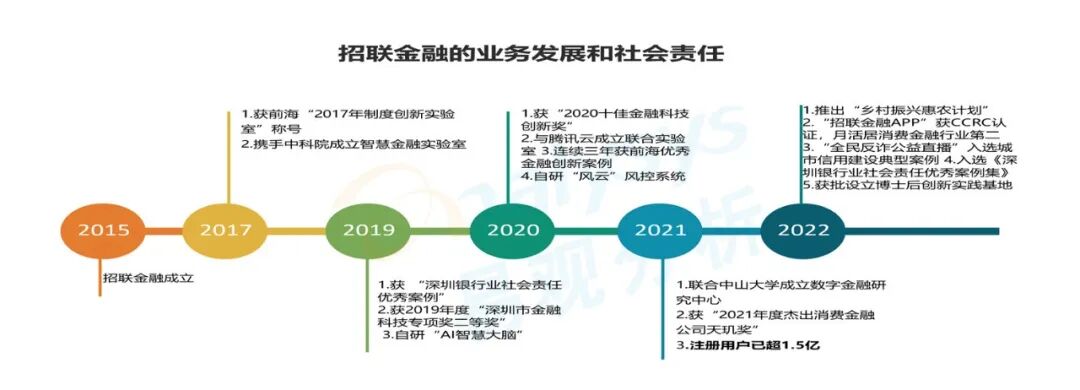从易观分析根据公开资料(百度百科及马上消费官网等),绘制的《马上消费的业务发展和社会责任》图来全面了解马上消费数字技术相关的大事件、业务里程碑及社会责任大事件:马上消费在2015年成立当年就自研了金融APP,并开始深耕科技自主创新。到2020年,仅用 5年时间实现注册用户从0-1亿突破,离不开背后的数字技术支撑,如其自主研发的人脸识别、唇语识别、智能语音识别、声纹识别,智能空号检测、OCR识别等通用技术及智能交互平台、风险管理平台、智慧双录系统、智能语音实时质检、刷脸支付、智能客服系统、智能联络中心系统、智能贷后管理系统等产品解决方案。2022年马上消费的注册用户已突破1.6亿,且上半年安逸花APP月平均活跃度近1000万,月活居消费金融行业第一。在后疫情时代,能取得这样的成绩,数字技术功不可没。首先,数字科技的背后,离不开马上消费的战略布局,据中国网财经报道,马上消费将“科技自主研发”战略上升到公司的核心战略布局,紧跟国家战略,始终将核心技术掌握在自己手中;同时,借助科技力量提升金融服务水平,实现降本增效,力求打造成科技驱动型金融机构。数字技术的背后,离不开数字人才团队的建设。据人民网报道,马上消费已组建了1700人研发团队,技术研发人员占比超70%;引进国家级、省部级以及“鸿雁计划”等高层次人才超30人,博士20余名。其次,马上消费通过产学研合作、成立博士后科研工作站、共建重庆应用数学中心、联合成立可信AI联合实验室等途径,推动人工智能、区块链、大数据等前沿科技在消费金融领域的研发创新和深度应用。再次,马上消费利用数字技术助力乡村振兴,“智慧养殖大数据平台”获“中国金融年度优秀社会责任项目”;利用数字技术赋能绿色低碳,荣获“2021年度碳中和先锋绿色金融企业”,并在2022年打造数字化办公协同平台,实现业务+办公全面数字化。据报道,截至2022年9月,马上消费通过自研金融云的绿色基础设施,已累计减少二氧化碳排放量4739吨;通过全线上化运营,使用电子合同、电子凭证等,累计减少122.42万吨碳排放;通过机器人客服,语音机器人等人工智能技术,累计减少二氧化碳排放量1617吨。最后,马上消费的数字技术成果也获得工信部、公安部等部委的认可,如获工信部中国信通院“大数据平台安全专项认证”、“安逸花”APP通过公安部网络应用人脸识别和活体检测技术安全性检测、人脸识别一体机通过公安部检测中心检测等。(二)招联金融的业务发展分析