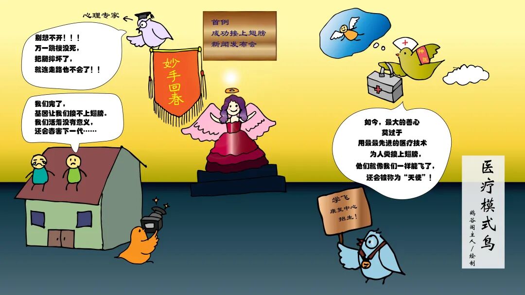 后来有了医疗模式,就像第2幅图,小鸟认为人必须接上翅膀才是完整的,必须学会飞才是正常的,如果不能接上翅膀,不会飞,不能被医疗拯救,生命就是一个悲剧。都像我们现在谈到发展障碍儿童从小必须接受干预,变得正常,整个童年别无选择。![]()