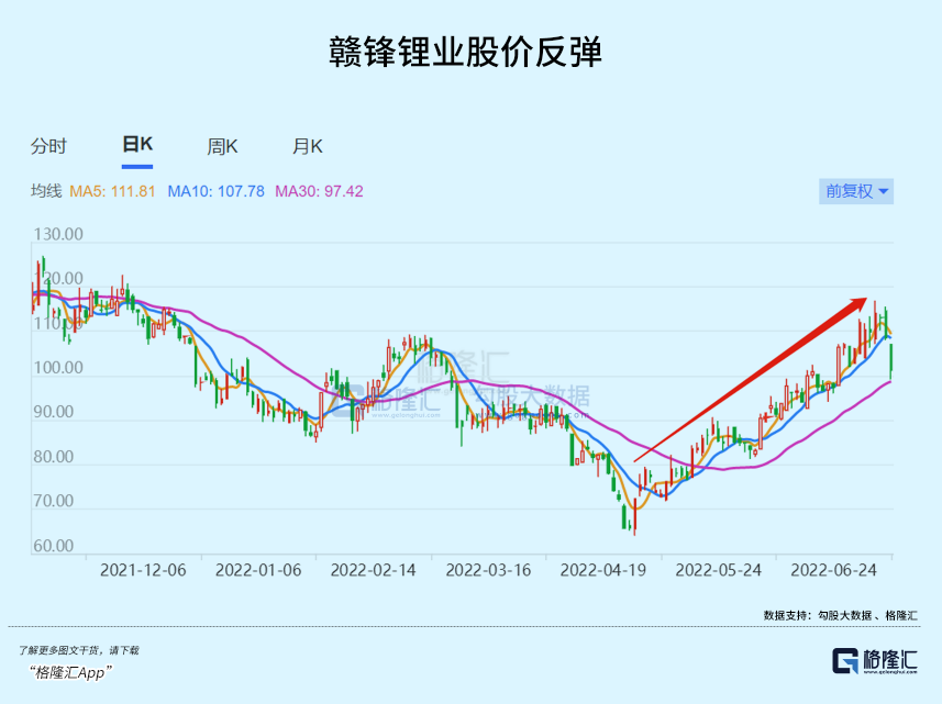 进入5月份,上海疫情解封,汽车产业链恢复,新能源汽车板块也出现强势反弹,特别是过去两个月频繁出台的新能源汽车消费刺激政策,给原本悲观的预期注入了强心针,股价更是一扫阴霾,节节攀升,如果从股价低位算起,赣锋的反弹幅度已经接近一倍。