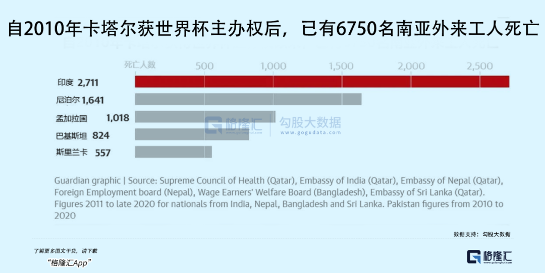 据印度、巴基斯坦、孟加拉、尼泊尔、斯里兰卡五国大使馆披露的数据,2010-2021年,共有6750名劳工确认死在卡塔尔,这个数据也包含了其它项目劳工。