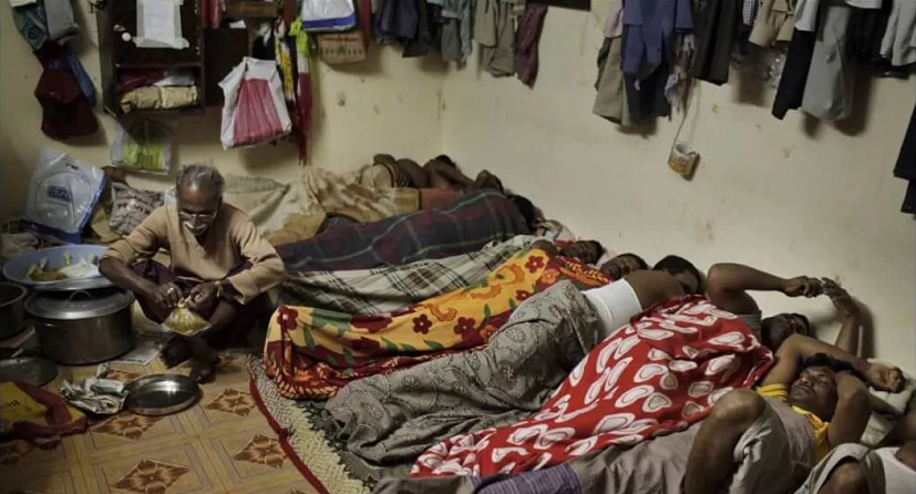 一般每间屋子会塞进十几个劳工。没有床,基本都是打地铺睡。厨房与厕所合二为一,吃喝拉撒全在一室,苍蝇横飞,蟑螂臭虫成群。
