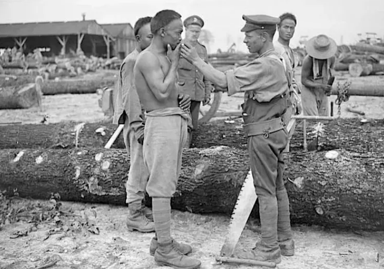 欧洲战场上,协约国士兵给中国劳工点烟