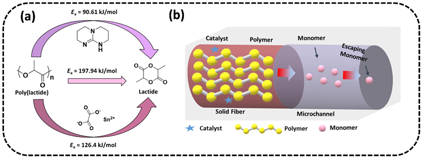 图1. (a) 聚乳酸热降解的途径及相应的活化能;(b) 牺牲组分汽化法制造微通道的机理示意图