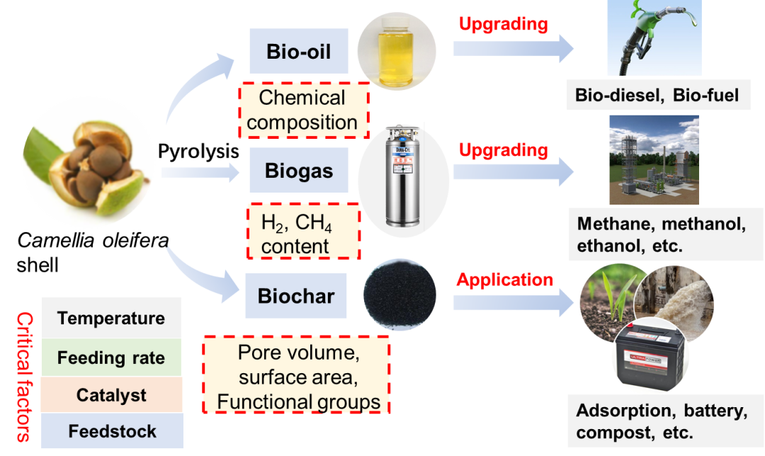 图4.油茶果蒲热解制备生物炭、生物气和生物油