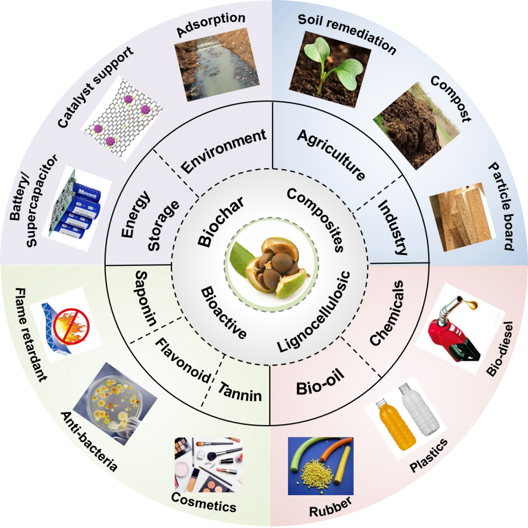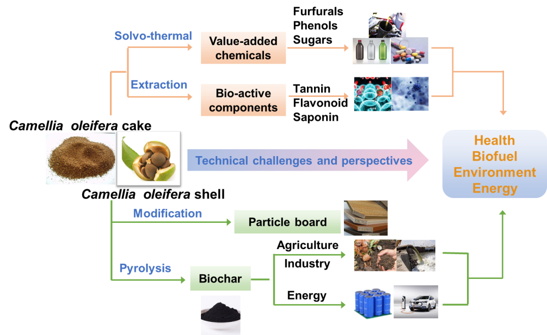 基于此,湖南省林业科学院李昌珠研究员团队联合四川大学生物质与皮革工程系等团队,系统地分析了油茶果蒲和油茶残粕中功能活性成分(黄酮、单宁和茶皂素)的提取方法及其在抑菌、抗氧化、抗炎症和乳化等方面的广泛应用,重点介绍了油茶果蒲三素组分制备高附加值化学品的溶剂和催化剂体系,同时分析了油茶果蒲制备生物炭、刨花板和农业肥料的性能和优势,着重对比了油茶果蒲生物炭在吸附、储能、土壤修复和固体酸催化剂等方面的应用,