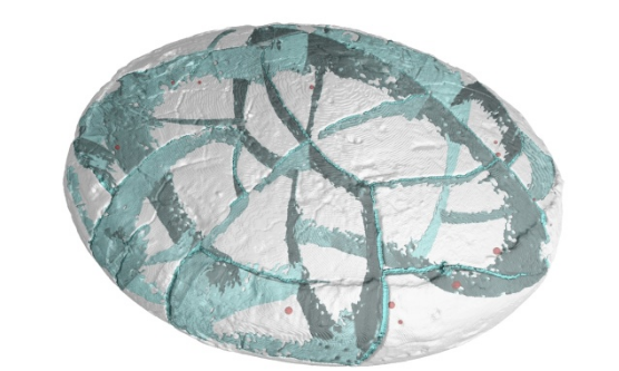 塑料颗粒的 3D 图像,裂缝以蓝色显示