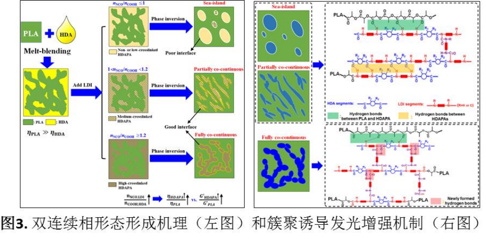 浙大宁波理工学院生物质高分子材料团队负责人刘宏治教授继2019年在高分子领域国际顶级期刊Macromolecules (2019,52,8415)上率先报道了L-赖氨酸二异氰酸酯(LDI)诱导植物油基氢化二聚酸(HDA)动态硫化增韧PLA策略后,与郑州大学材料学院刘浩副教授合作,通过调控这两种生物基单体反应性基团的当量比(nNCO,LDI/nCOOH,HDA),成功制备出兼具增强簇聚诱导荧光发光性能(CTE)和平衡力学强度(较纯PLA仅降低20%)的超韧PLA共混物(如图2所示)。