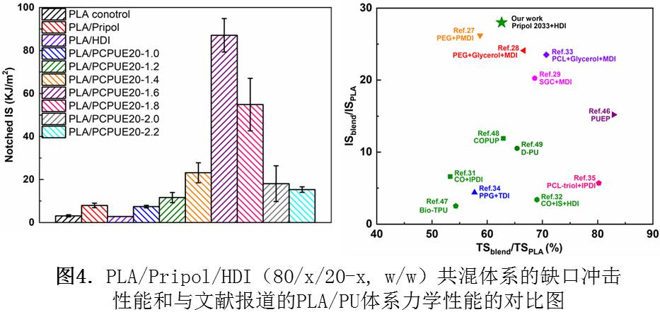 此外,刘宏治教授又将该原位动态硫化增韧策略推广到植物油基二元脂肪醇(PripolÔ 2033)/脂肪族二异氰酸酯(HDI)二元单体体系,同样制备出冲击韧性最高达87.1 kJ×m-2(约为纯PLA的28倍)的超韧PLA材料(如图4所示)。