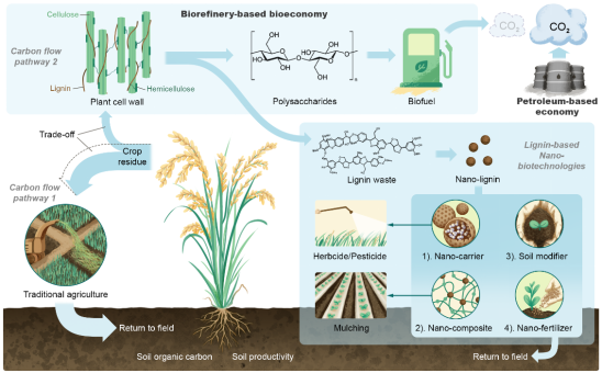 论文紧扣国家绿色农业可持续发展的战略需求,从农业生态系统碳循环路径的视角出发,提出了一条提高生物炼制经济效益和促进农业可持续发展的双赢策略:利用纳米生物技术将秸秆生物炼制中产生的大量木质素废弃物转化为可用于农业生产的高值化产品,如农用化学品载体、土壤改良剂、生物降解农业地膜、纳米肥料等(图1中Carbon flow pathway 2),使纳米化的生物质产品在服务于农业生产的同时回归农业生态系统,不仅能提高生物炼制的碳利用效率、促进生物经济发展,还可以维持农业生态系统功能并稳定农田土壤碳封存、促进以纳米农业技术为基础的可持续农业的发展。