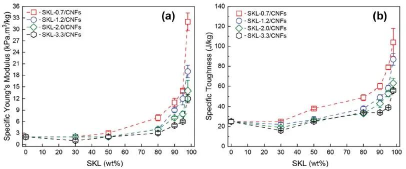 Figure 4. Compressive performance of SKL-d/CNF foams with increasing SKL weight fractions (from 0 to 98 wt%). (a) Specific compressive modulus in kPa m3/kg and (b) specific toughness in J/kg.