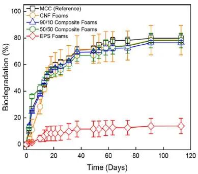 Figure 5. Biodegradation profile (%) of lignocellulosic foams and EPS foams over time conducted in a marine inoculum at 25 °C and pH 7.