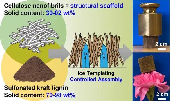 基于此,来自北卡罗来纳州立大学的Nathalie Lavoine等人利用CNFs的网络和排列,通过冰模板法制备出非脆性、强韧的木质素基固体泡沫。特别地,通过选择一系列具有不同磺化程度的水溶性磺化硫酸盐木质素(SKLs),使CNFs与工业木质素的水悬浮液均匀结合。本研究讨论了用这种双模板方法制备的各向异性木质素基泡沫的结构-加工-性能关系,并显示出这种设计的泡沫比石油衍生泡沫具有更加理想的应用前景。