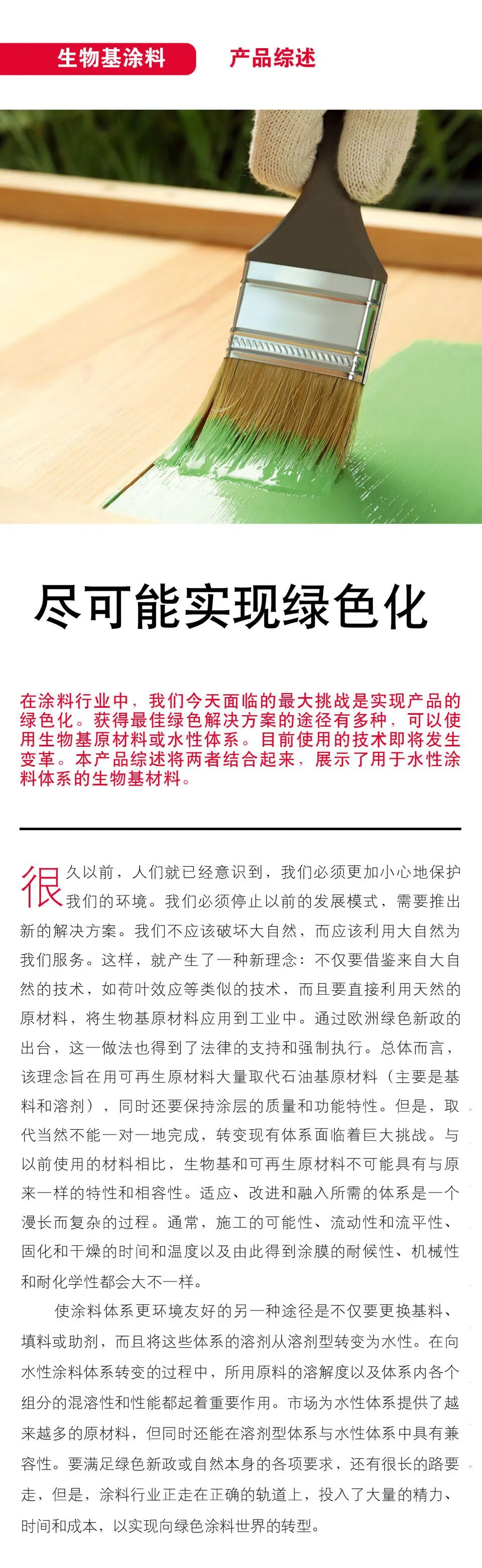在涂料行业中,我们今天面临的最大挑战是实现产品的绿色化。获得最佳绿色解决方案的途径有多种,可以使用生物基原材料或水性体系。目前使用的技术即将发生变革。本产品综述将两者结合起来,展示了用于水性涂料体系的生物基材料。