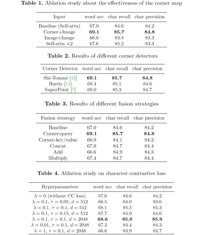 为了验证模型中每一部分设计的有效性,文中实施了四组实验,分别验证角点图的有效性、不同角点检测器对性能的影响、不同融合策略的影响以及字符对比损失中超参数的影响。实验结果表明,在去掉角点分支且维持参数量不变的情况下、以及把角点分支的输入换成其他输入时,都会造成性能损失;使用不同的角点检测器会对结果造成轻微差异,但都好于不使用角点的情况,而且模型对角点检测的质量具有一定的鲁棒性;传统常用的融合方式并不能充分发挥角点的作用,而角点查询机制可以显著改善模型性能;字符对比损失可以显著改善识别性能,但不同的超参数对该损失函数的影响较大,文中选取了一组近似最优的参数设置。
