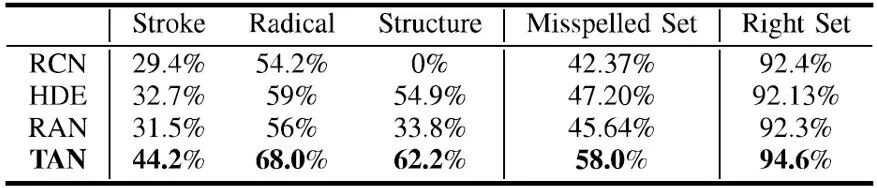 表4本文方法(TAN)与其他偏旁部首的文本识别方法的对比