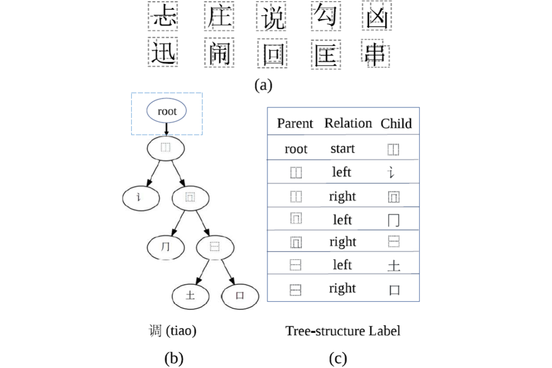 图3(a)十种汉字结构示例(b)“调”的树形式(c)“调”的树结构标签2、分解模块