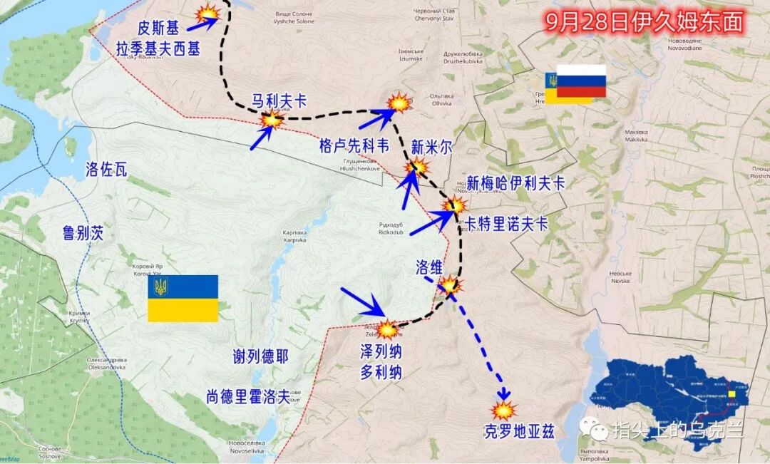 伊久姆东边的战斗又进入一个非常复杂的状态,乌军收复了皮斯基拉季基夫西基和马利夫卡等多处村庄,同时通过洛维向面南的克洛地亚兹方向突破,根据昨天晚上最新的战报,双方目前在克罗地亚兹方向有激烈的战斗,今天上午的战报显示乌军已经收复克罗地亚兹。