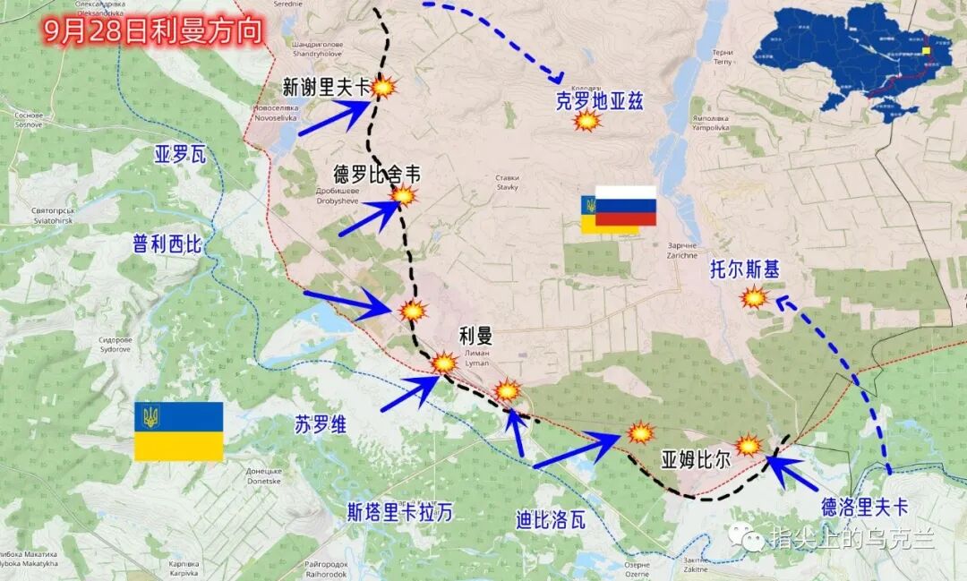 利曼方向的战斗更加复杂,除了在原有的这几个交战地点以外,昨天晚上的最新战报显示乌军已经从东面突破到了托尔斯基,从北面突破到了克罗地亚兹,目前已经对整个利曼和亚姆比尔方向的俄军实施了合围。