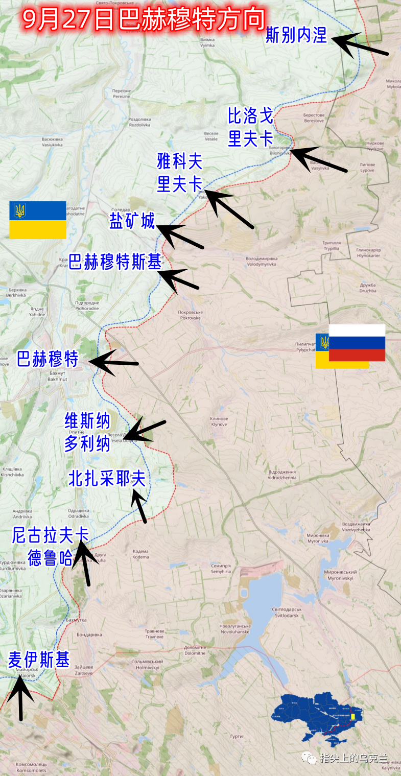 从今天开始,盐矿城与巴赫穆特方向的地图进行合并表示,从昨天的战况来看,双方交火区域有10个,控制区域基本没变。