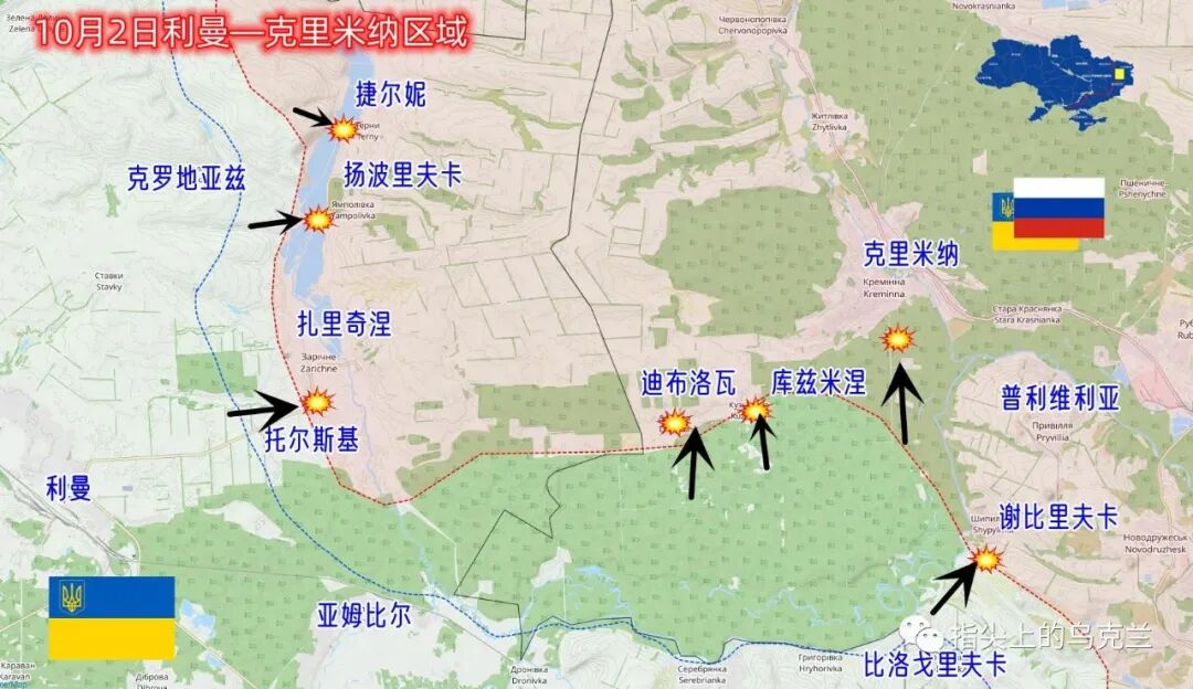 乌军在收复利曼之后,继续向东推进,但是很明显可以看到推进速度已经放缓,目前双方交战的地点有托尔斯基,扬波里夫卡和捷尔尼三处渡河口。克里米纳方向乌军主要在迪布罗瓦,库兹米涅以及克里米纳南郊这三处地点与俄军展开交火。根据前线的战报来分析,乌军目前仍然在清理利曼周边地区残留的俄军,同时对俄军新防线保持一定的压力,下一轮进攻预计还需要一定时间。