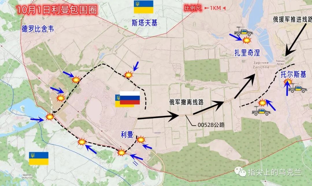 俄军方面,从克里米纳方向方向赶来支援部队,目前正在托尔斯基与扎里奇涅建立防御阵地,目的就是保护00528公路交通线,确保利曼方向的俄军能顺利撤离。利曼城区的俄守军,目前一部分正沿着00528公路撤离,一部分在利曼城中实施边打边撤的战术,同时在城里各处埋设地雷,以延缓乌军进攻速度。