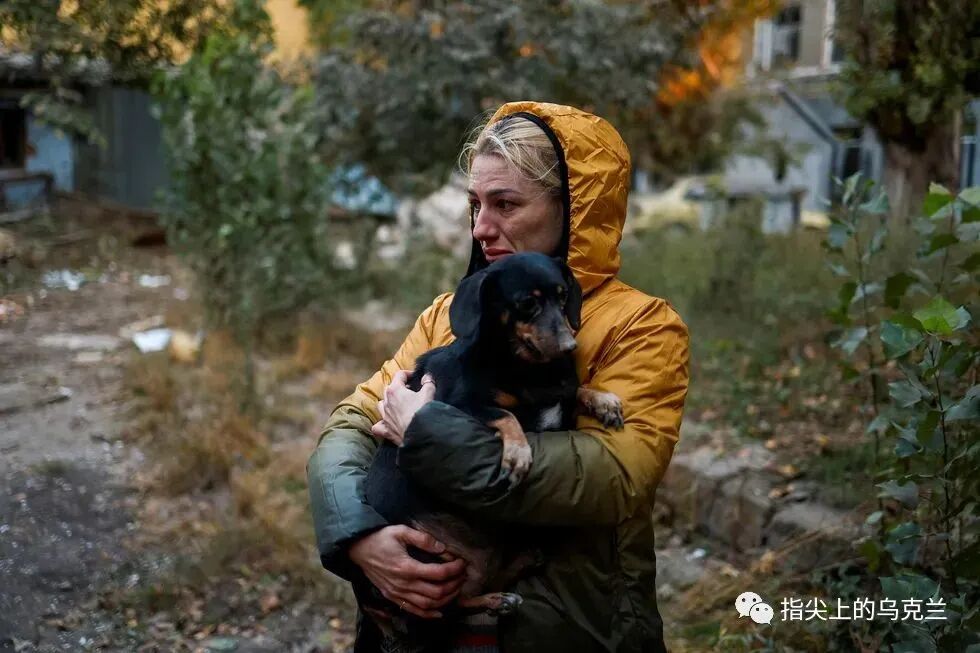 这位尼古拉耶夫居民带着自己的宠物无奈看着被摧毁的家园