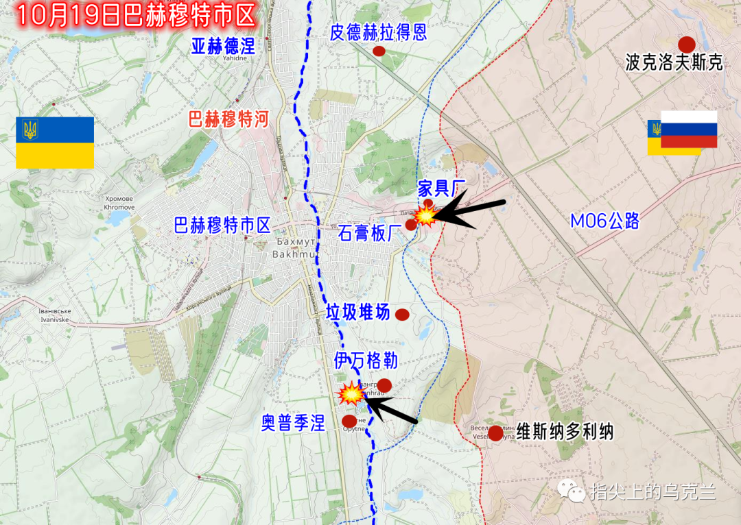 今天巴赫穆特市区方向的战斗有所减弱,瓦格纳的进攻方向主要在家具厂与石膏板厂中间区域,南面的伊万格勒和奥普季涅继续遭到俄军炮火的猛烈攻击,从前线战报来分析,伊万格勒村已经被夷为平地,不具备防守的价值,双方地面部队继续在奥普季涅村周边巴赫穆特河沿岸展开攻防战。从最新战报来看,目前乌军仍坚守阵地。