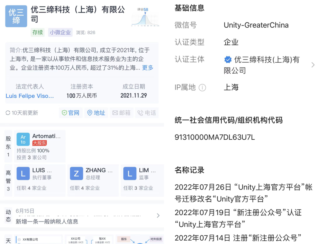 另外笔者还发现,就在7月26日“Unity上海官方平台”微信公众号账号迁移改名为“Unity官方平台”,认证主体为优三缔科技(上海)有限公司。
