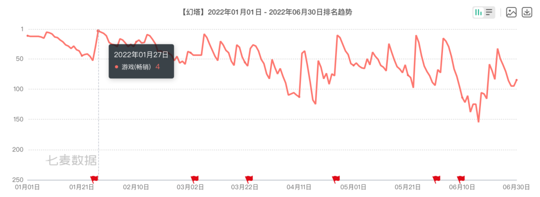 七麦数据显示,2022年Q1,《幻塔》App Store游戏畅销榜最高排名Top4,排名中线Top20左右;Q2,该作表现略有下滑,但整体畅销榜排名中线仍稳定在Top60左右。