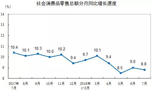 让我们把镜头拉回到一年前:2017年7月份,社消品零售总额29610亿元,同比名义增长10.4%(扣除价格因素实际增长9.6%)。其中限额以上单位消费品零售额12813亿元,增长8.6%。