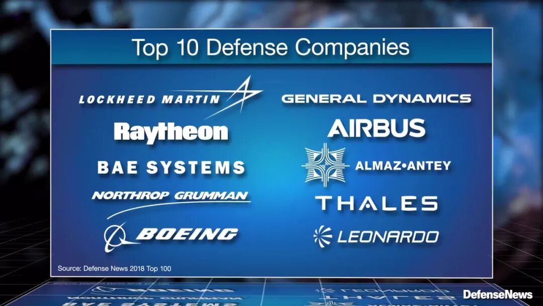 排名前十为洛克希德·马丁、雷声、BAE系统、诺斯罗普·格鲁曼、波音、通用动力、空客、金刚石-安泰、泰雷兹、莱昂纳多
