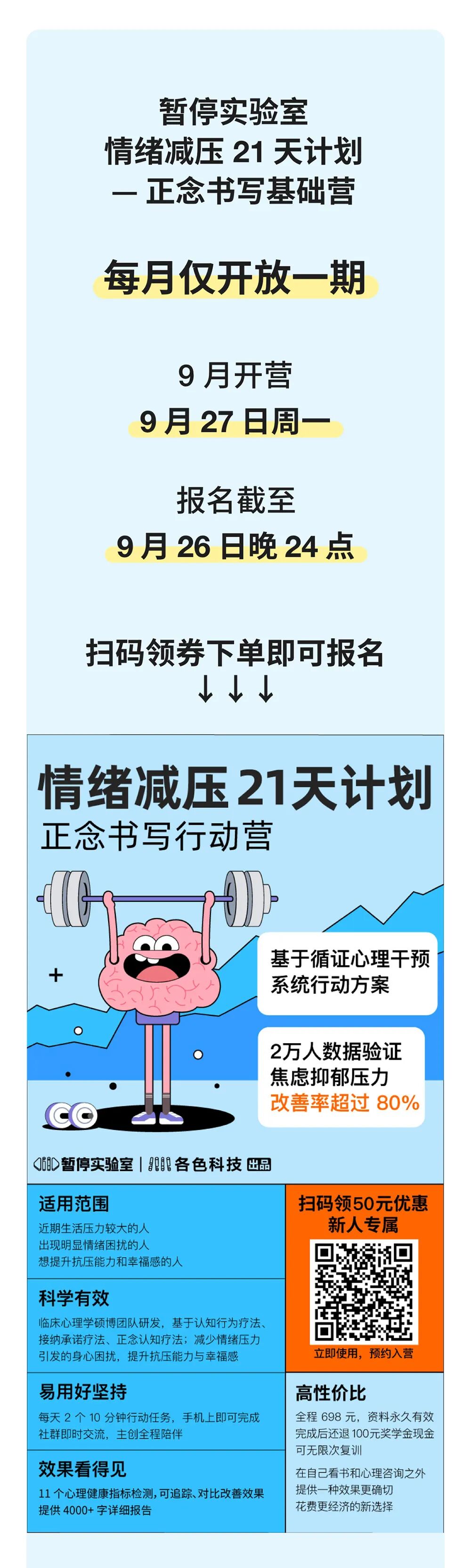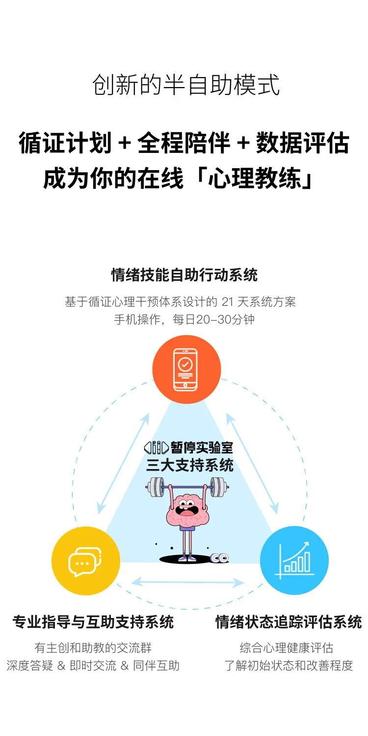 功能介绍 全科班心理硕博创立的「数字化心理健身房」,提供改善情绪 | 饮食 | 睡眠困扰的循证干预EBP方案。每天暂停一下,用专业的方式照顾自己。