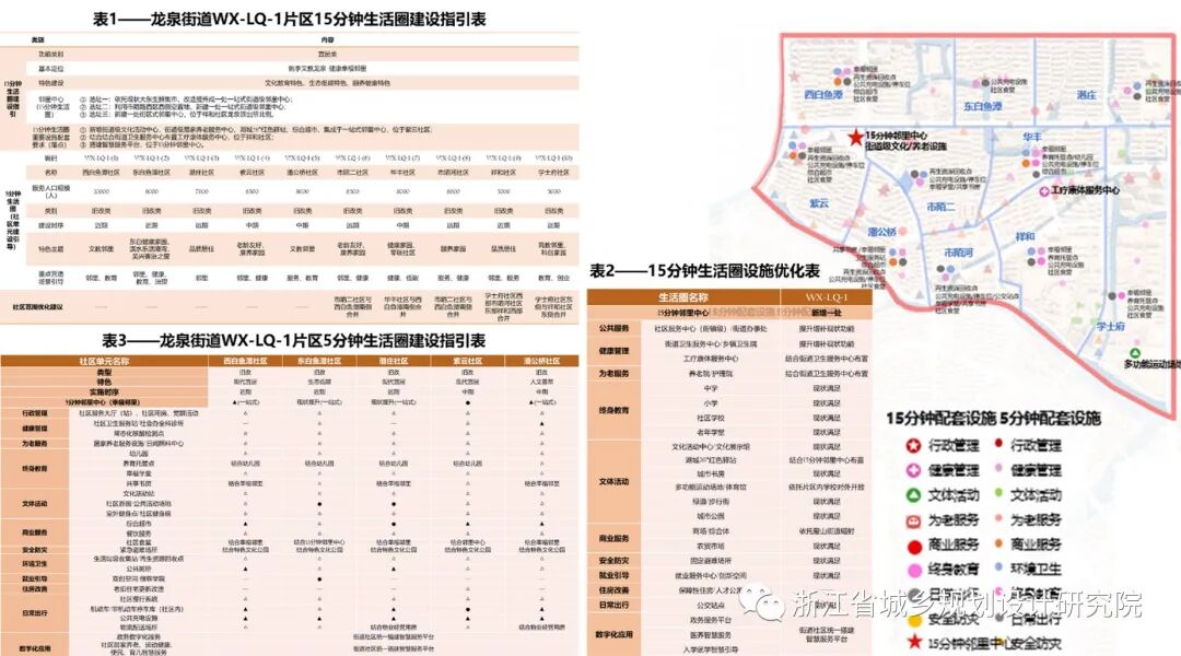 每个15分钟生活圈建设指引中涵盖“一图三表”包括两级生活圈建设指引一张图、15分钟生活圈设施优化配置表、15分钟生活圈设施建设指引表和5分钟生活圈(社区单元)设施建设指引表。