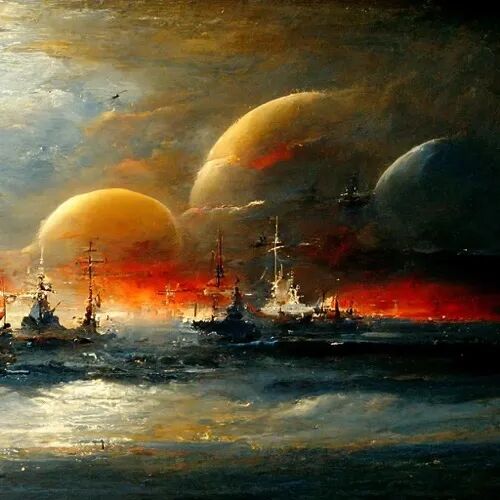 根据你的基准,有人可能会争辩说 AI 要么满足这些标准,要么距离很远。像 Midjourney 这样的产品可以在几秒钟内以几美分的价格轻松生成令人愉悦的图像。当我要求它创建一个特纳式的外星海景时,护卫舰在日落时战斗,它做了这样的输出: