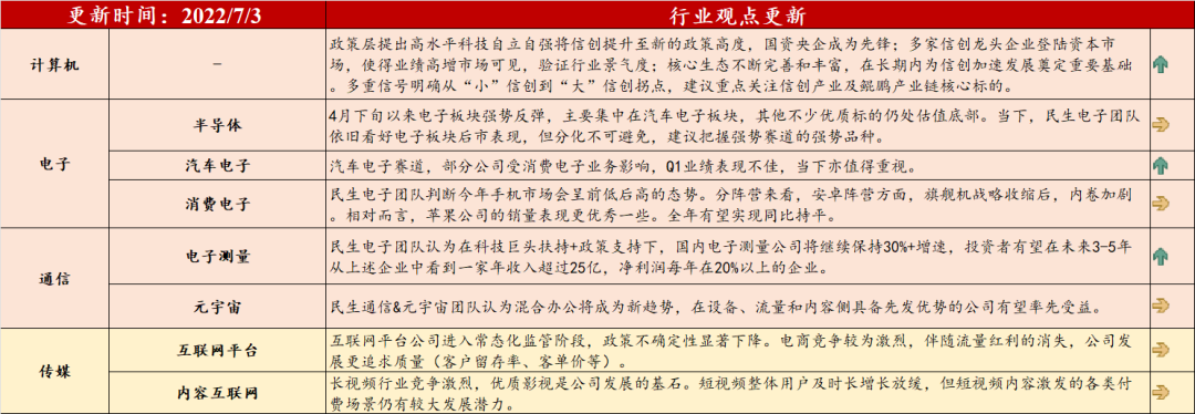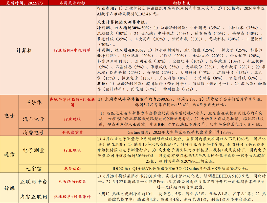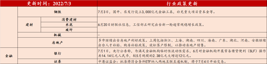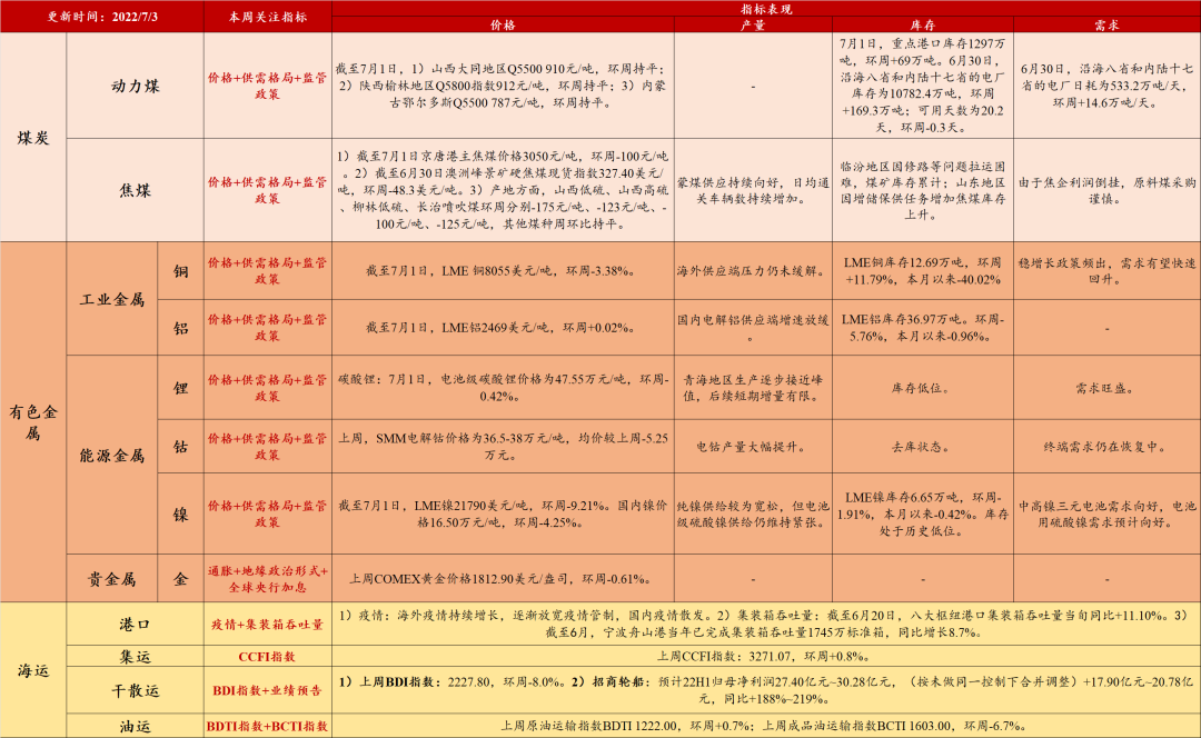 能源与资源板块:1)动力煤:截至6月30日,沿海八省和内陆十七省电厂日耗533.2万吨/天,环周+14.6万吨/天,价格基本持平。民生煤炭团队判断,板块业绩预告将于近期出炉,今年上半年煤价同比大幅增长,板块主流公司业绩增幅将超过50%。2)焦煤:民生煤炭团队判断焦煤基本面趋于宽松,短期将弱稳运行。3)金属:美联储鹰派发言,美元指数维持高位下金属价格整体偏弱运行,其中,LME铜环周-3.38%、LME铝环周+0.02%、LME镍环周-4.25%。民生金属团队认为铝方面,供应端复产接近尾声,社会库存周度下降1.7万吨,持续去库。当前部分铝厂已有亏损,下方成本支撑较强。4)航运:上周BDI指数环周-8.0%,BDTI指数环周+0.7%;BCTI指数环周-6.7%。招商轮船发布业绩预告,预计22H1归母净利润27.40亿元~30.28亿元,(按未作同一控制下合并调整口径)同比+188%~219%,超市场预期。