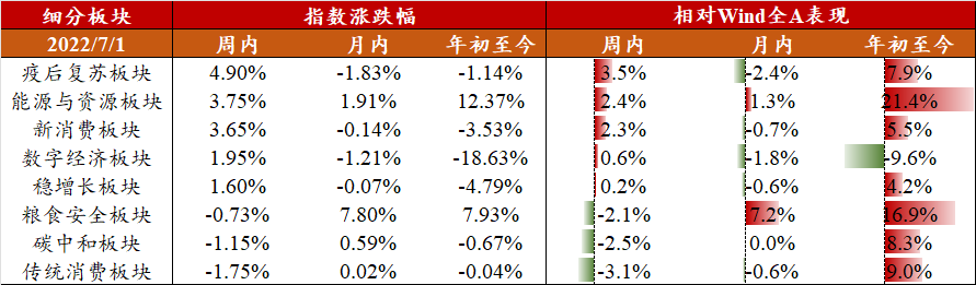 碳中和板块领涨,能源与资源板块表现落后。上周(2022.06.27-2022.07.01)八大板块中,涨幅排序依次疫后复苏>能源与资源板块>新消费>数字经济>稳增长>粮食安全>碳中和>传统消费。年内维度看,能源与资源板块涨幅第一,年初以来跑赢Wind全A指数21.4个百分点。
