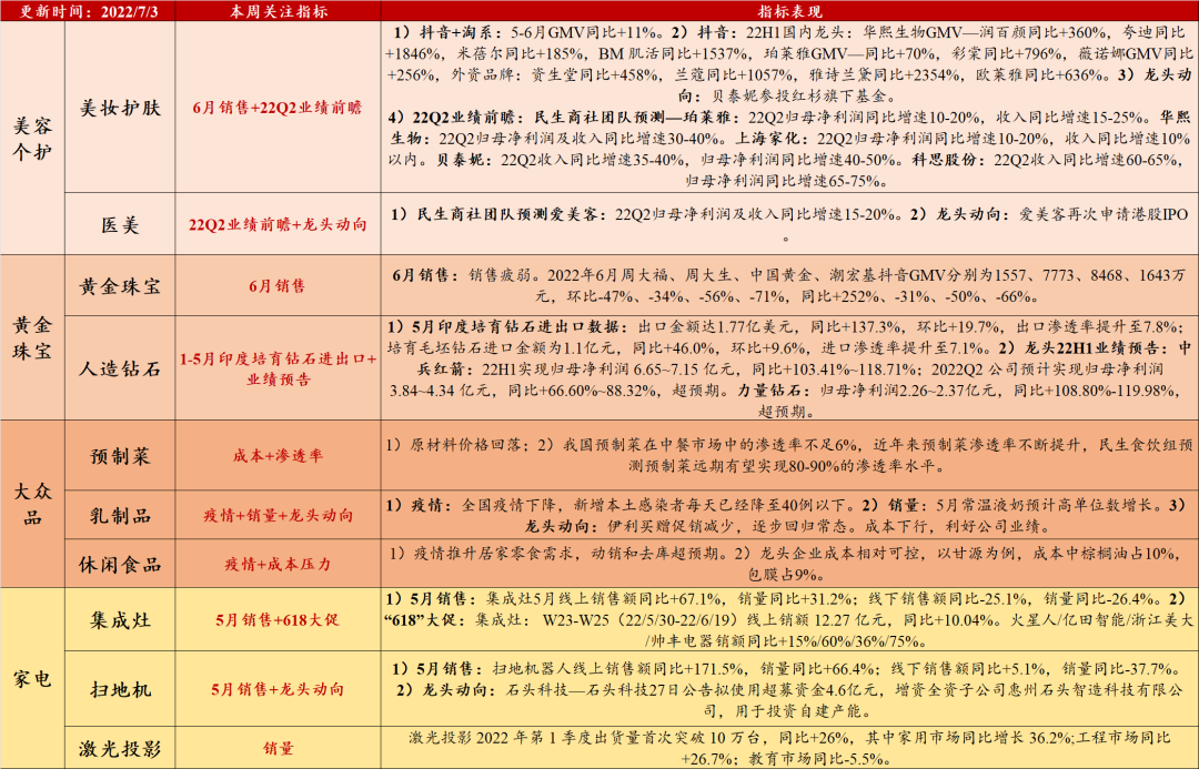 新消费板块:1)6月抖音平台:国货美妆龙头销售高增。根据民生商社团队数据,华熙生物旗下品牌GMV—润百颜同比+360%,夸迪同比+1846%,米蓓尔同比+185%,BM 肌活同比+1537%,珀莱雅旗下品牌GMV—珀莱雅同比+70%,彩棠同比+796%,贝泰妮旗下品牌GMV—薇诺娜同比+256%。黄金珠宝表现疲弱。6月周大福、周大生、中国黄金、潮宏基抖音平台GMV分别为1557、7773、8468、1643万元,同比+252%、-31%、-50%、-66%,环比-47%、-34%、-56%、-71%。2)培育钻石龙头业绩高增。中兵红箭和力量钻石发布22H1业绩预告。1、中兵红箭:22H1实现归母净利润 6.65~7.15 亿元,同比+103.41%~118.71%;2022Q2 公司预计实现归母净利润 3.84~4.34 亿元,同比+66.60%~88.32%。2、力量钻石:22H1实现归母净利润2.26~2.37亿元,同比+108.80%~119.98%。