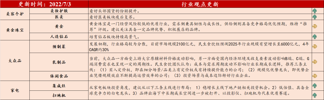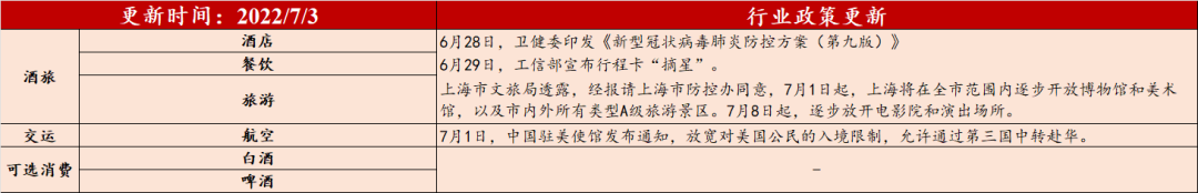 疫后复苏板块:1)疫情散发:无锡、宿州泗县疫情再起。2)防控政策边际放宽:6月28日,卫健委印发《新型冠状病毒肺炎防控方案(第九版)》,缩短密接、入境人员隔离管控时间至7+3天。6月29日,工信部宣布行程卡“摘星”。3)航空板块持续回暖:需求端,截至6月30日当日,国内执行航班量10449架次,环周+14.3%。供给端,国航、东航、南航与空客公司签订协议,拟购买292架飞机,并计划于2023-2027年分批交付。4)白酒板块:批价基本维持稳定。上周飞天散瓶2720-2775元,整箱批价3010-3065元,环周基本持平。普五批价约965 元,环周持平;国窖1573批价约920元,环周持平。据民生食饮团队数据,国内主要城市消费复苏节奏自4月底开始明显加快,“五一”后部分地区餐饮端消费复苏速度好于市场预期。