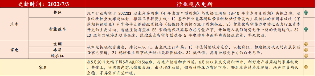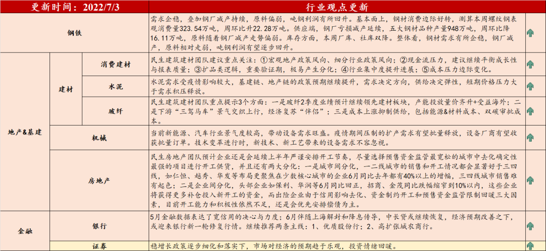注:1、红底部分的观点来自于行业团队,黄底部分的观点来自策略团队。2、最后一栏箭头表示细分行业基本面较上周的表现,箭头向上代表行业基本面环比上周走强,箭头向下代表行业基本面环比上周走弱,箭头水平则代表行业基本面较上周持平。