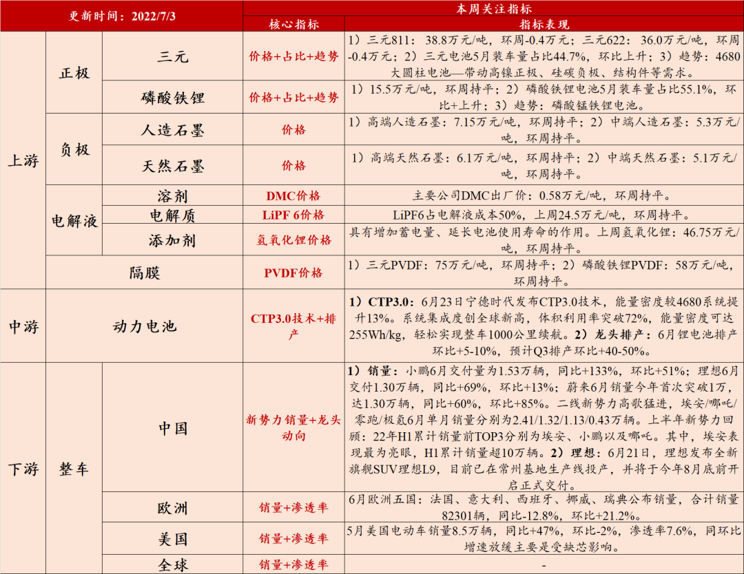 碳中和板块:1)新能源车销量超预期:根据民生电新团队数据,6月小鹏:交付量1.53万辆,同比+133%,环比+51%;理想:1.30万辆,同比+69%,环比+13%;蔚来:1.3万辆,同比+60%,环比+85%;埃安:2.4万辆,同比+150%,环比+14%;哪吒:1.3万辆,同比+156%,环比+19%;零跑:1.1万辆,同比+178%,环比+12%;极氪:0.43万辆,环比-1%。欧洲五国6月电动车销量数据略低预期。法国、意大利、西班牙、挪威、瑞典6月销量合计8.23万辆,同比-12.8%,环比+21.2%。2)光伏:硅料供给仍紧张,价格延续上涨。上周致密料价格升至283-288元/kg,环周+4.83%;复投料价格升至285-290元/kg,环周+5.10%。隆基、中环上调硅片价格。a隆基:官网价格P型182mm硅片每片报价7.3元,+6.4%;166mm硅片报价6.08元/片,+6.3%;158.75mm硅片报价5.88元/片,+6.5%。b中环:182mm/155μm规格单晶硅片价格7.25元/片,+6.4%;210mm/155μm规格单晶硅片价格9.55元/片,+5.5%。电池片厂家大多暂停报价和发货,静待上游硅片价格落地。3)储能:《防止电力生产事故的二十五项重点要求(2022年版)(征求意见稿)》提出,中大型电化学储能电站不得选用三元锂电池、钠硫电池,不宜选用梯次利用动力电池。