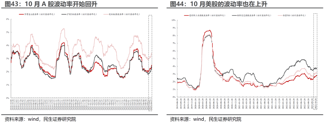 10月全部A股上涨个股占比大幅回升至57.5%,同时个股涨跌幅标准差持续降低。10月A股与美股的波动率均开始上升。如果假设2022年10月的M2同比增速与2022年9月持平,那么10月全部A股自由流通市值/M2将较9月下降23个BP至12.76%,这意味着A股自由流通市值相对于M2的扩张速度继续放缓。当前流动性对估值的约束进一步缓和,但基本面预期的分化依旧是导致市场出现结构分化的核心。尽管基本面的路径仍存争议,但A股未来将从极度悲观的经济预期中修复,投资者当务之急是选择去往修复弹性最大的地方等待。