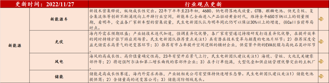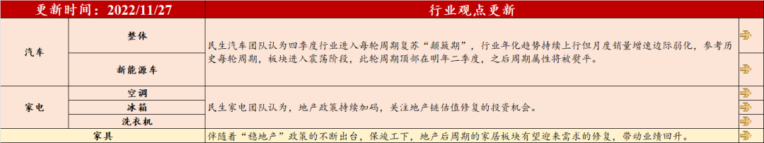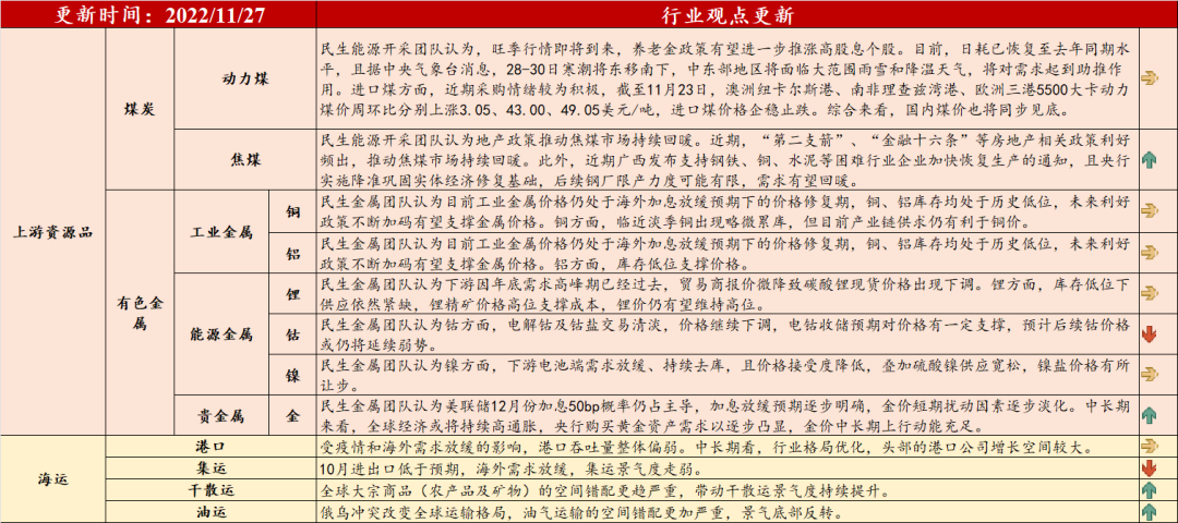 注:1、红底部分的观点来自民生行业团队,黄底部分的观点来自民生策略团队。2、最右边栏箭头表示细分行业基本面较上周的表现,箭头向上代表行业基本面环比上周走强,箭头向下代表行业基本面环比上周走弱,箭头水平则代表行业基本面较上周持平。![]()