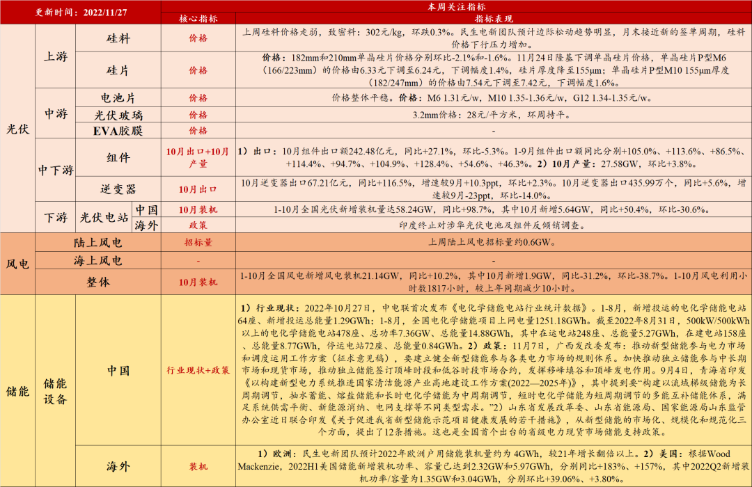 2)光伏:a、硅料:上周硅料价格走弱。上周致密料价格302元/kg,环跌0.3%。民生电新团队预计边际松动趋势明显,月末接近新的签单周期,硅料价格下行压力增加。b、硅片:硅片价格环比下行。182mm和210mm单晶硅片价格分别环比-2.1%和-1.6%。11月24日隆基下调单晶硅片价格,单晶硅片P型M6(166/223mm)的价格由6.33元下调至6.24元,下调幅度1.4%,硅片厚度降至155μm;单晶硅片P型M10 155μm厚度(182/247mm)的价格由7.54元下调至7.42元,下调幅度1.6%。c、10月新增装机:同比维持高增长。1-10月全国光伏新增装机量达58.24GW,同比+98.7%,其中10月新增装机量5.64GW,同比+50.4%,环比-30.6%。